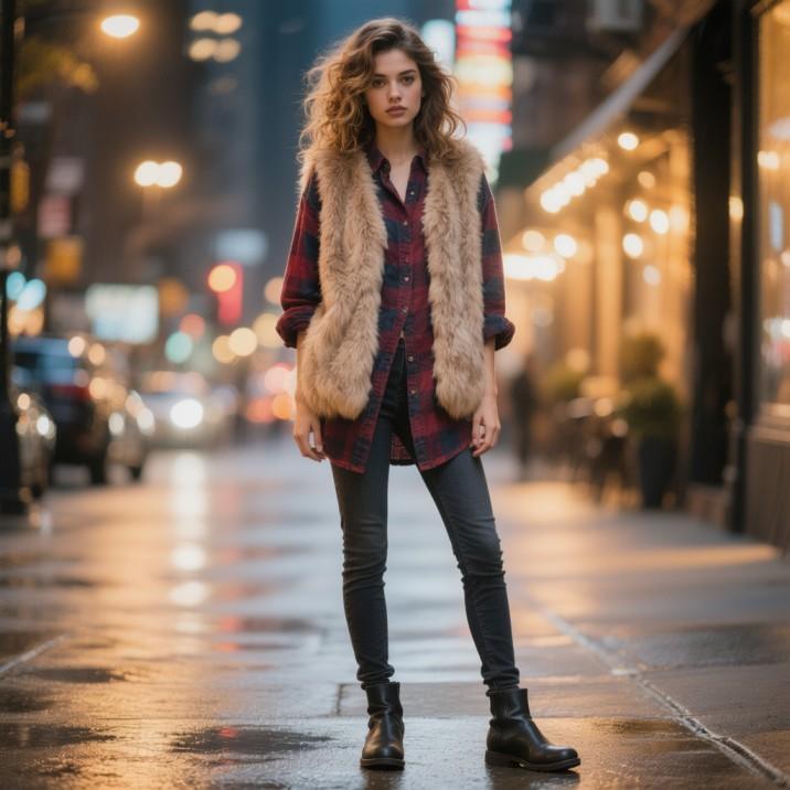 1. Oversized Flannel + Faux Fur Vest + Dark Jeans