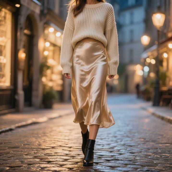 Satin Midi Skirt + Cropped Knit Sweater + Ankle Boots